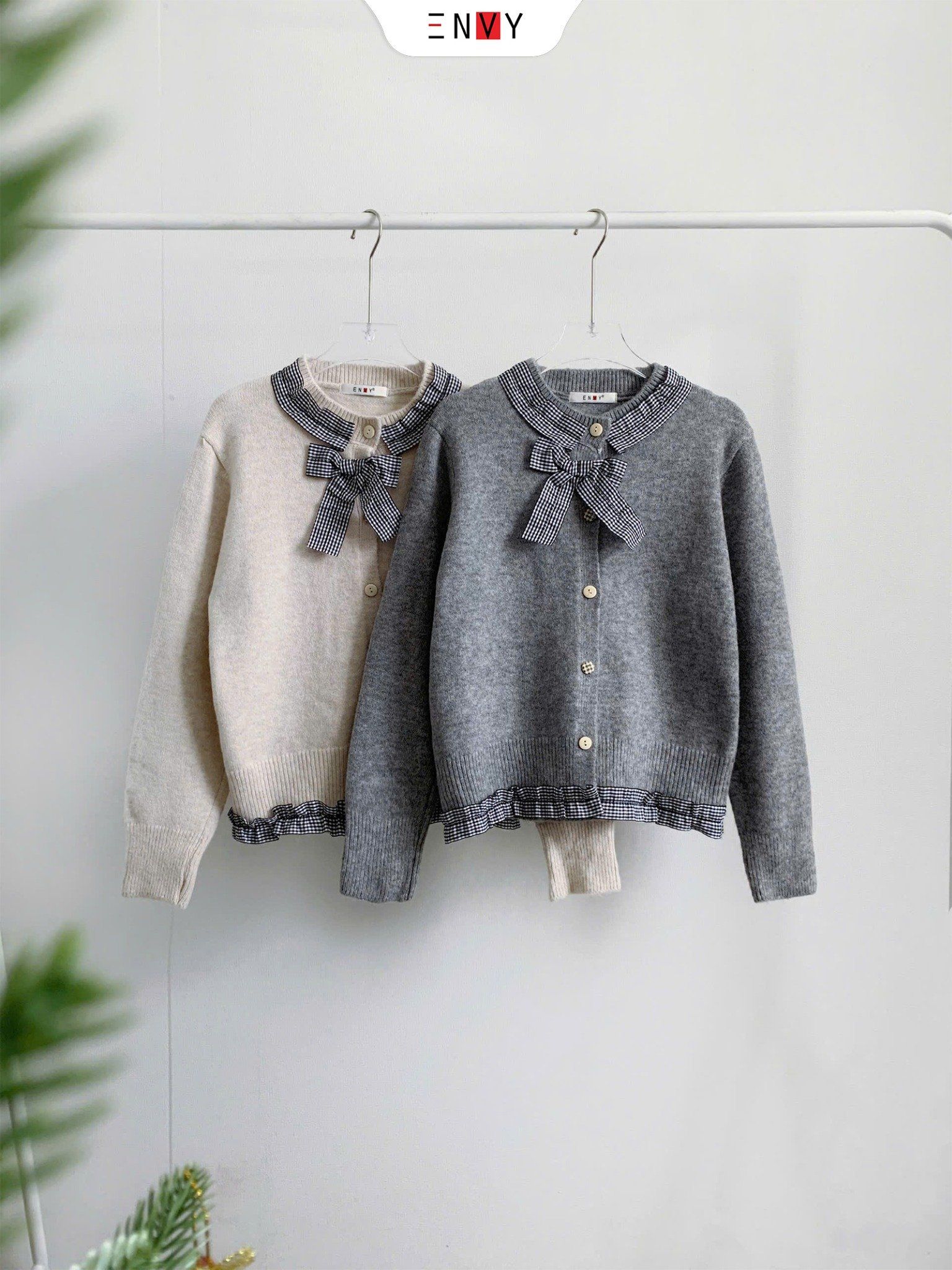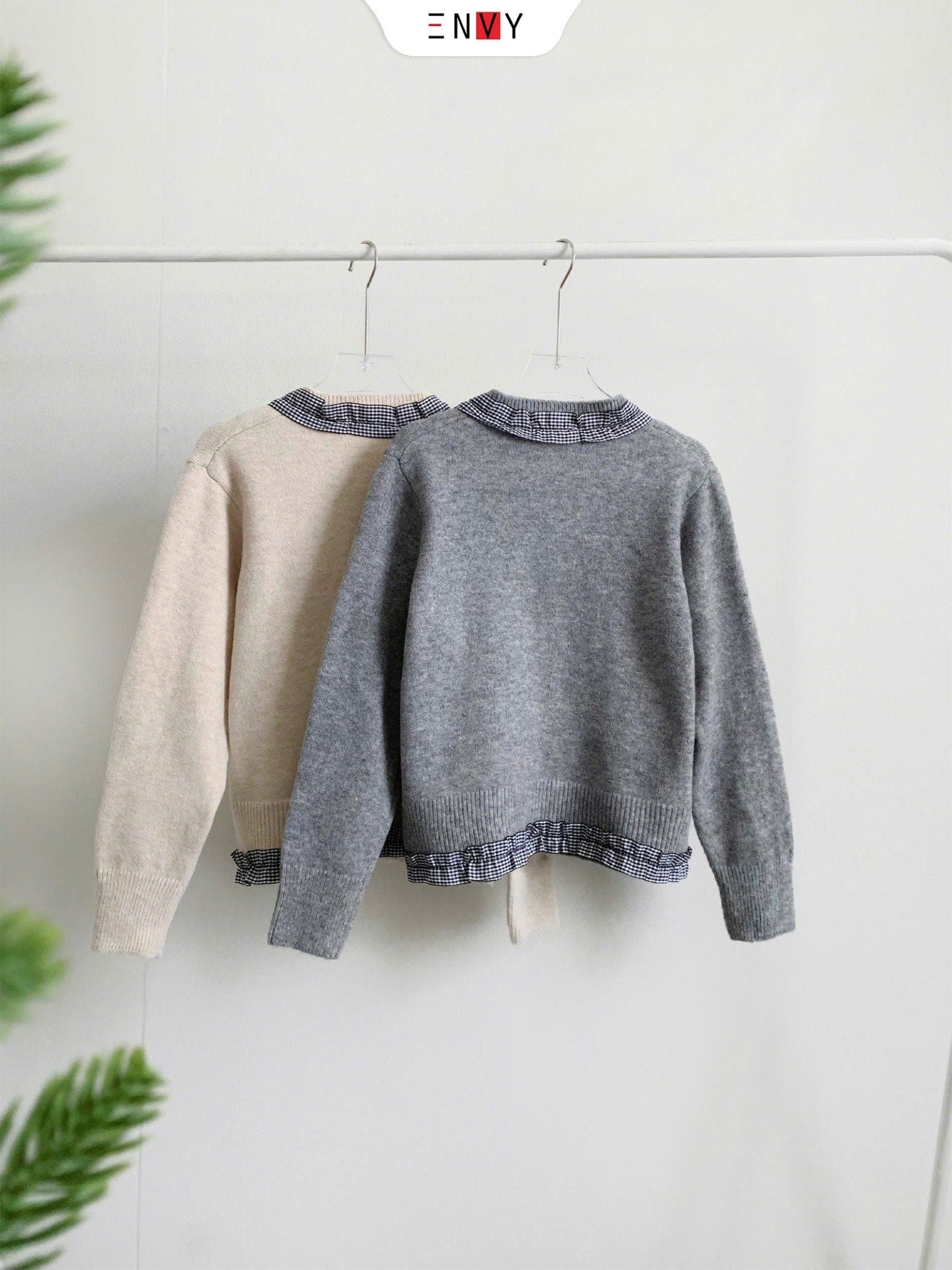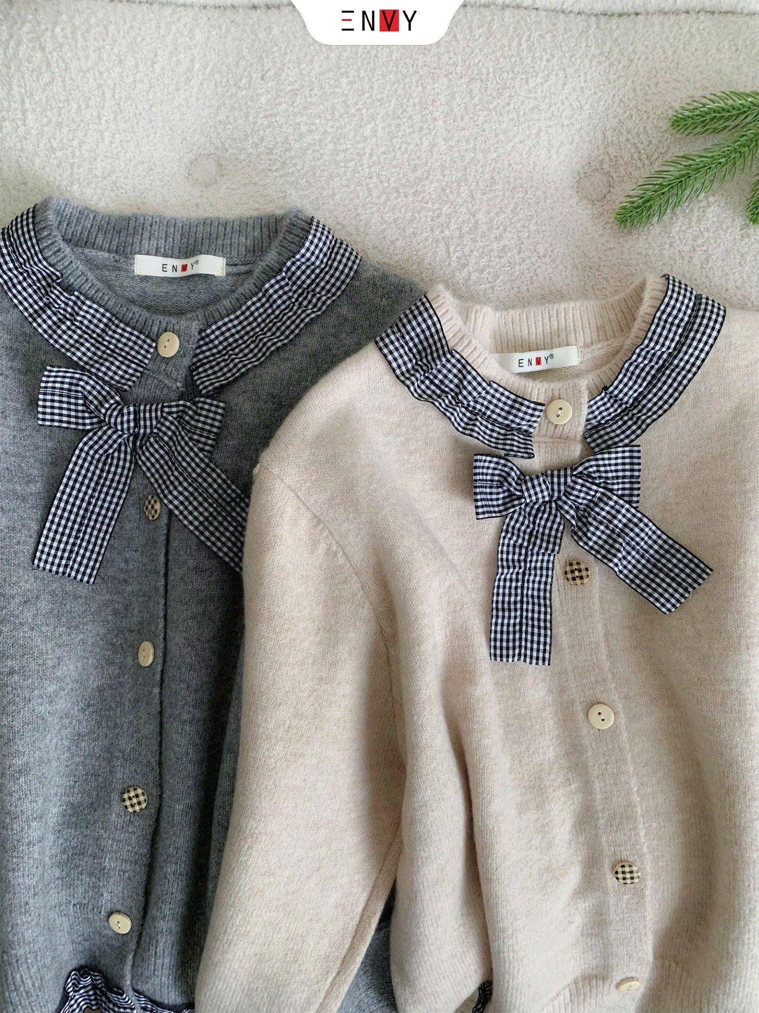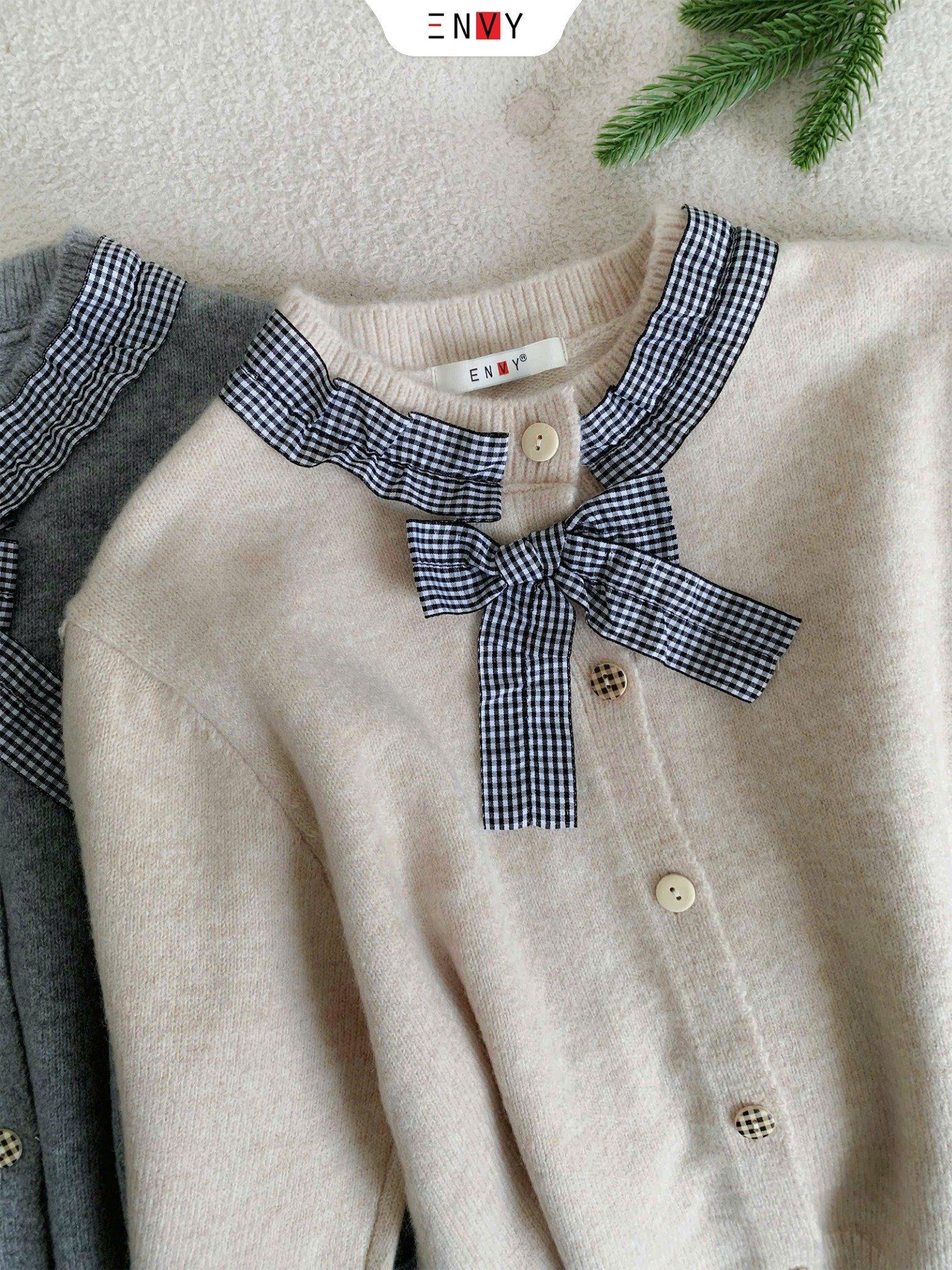 Áo Len Lông Thỏ Viền Nơ Caro