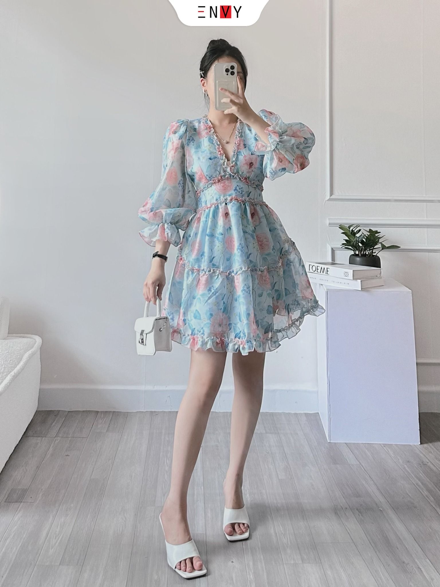 • Ưu điểm sản phẩm: Đầm hoa cổ V tay lỡ nữ tính, chất vải voan mỏng nhẹ, thoáng mát, họa tiết hoa nổi bật, tươi tắn. Thiết kế dáng tầng nữ tính, hở lưng kiểu cách.
